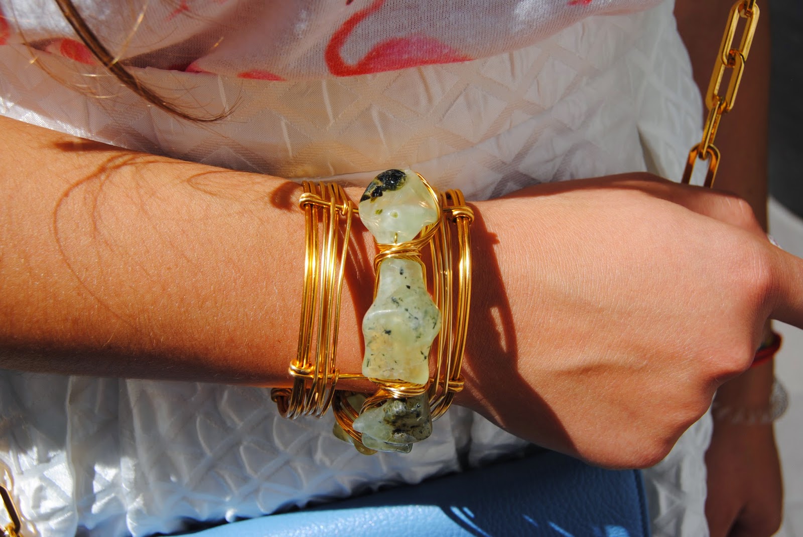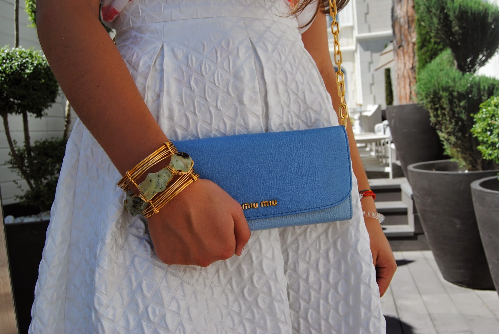 I am currently in St. Tropez, my last holiday for this summer. I took a few pictures to show you the beautiful harbour and the lovely, little, colourful port buildings. If you have never been to St. Tropez, I suggest you go there for a vacation because it's just wonderful and it's THE place to be. Whilst walking around these past days, I saw this adorable terrace where I decided to shoot my outfit photos. I wore this midi skirt that made quite a hit this summer. I love this skirt for when it's really warm outside, it's so airy and light. If you are looking to buy one I recommend you look at Topshop as they have a large selection of midi skirts and in various colours. I matched my skirt with a white flamingo-themed T-shirt, this pattern was a little trend this summer together with the fruit and flower trend which by the way is still ongoing at the moment. I added as final accessories a gold and green stoned bracelet and my gorgeous new Miu Miu bag and sunglasses. Where have you been on vacation this summer ? xxx