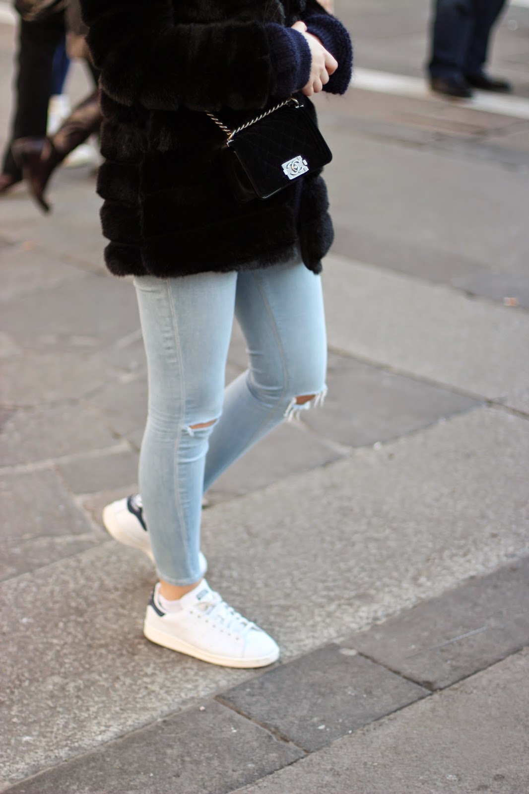 Even though the weather was extremely beautiful, it was still a bit chilly so I chose to wear my Storets jacket, which I ordered from their online store last winter after having spotted the fabulous Chiara Ferragni in a light pink version. My coat, being fake fur, didn't stop me from still feeling nice and warm. I can only recommend this jacket! I chose a small sized crossbody bag in order to have my hands free when shopping around. These types of bags are so handy and all you need is your cash or credit card(s), obviously your mobile phone to take the occasional mirror selfie and you're good to go.