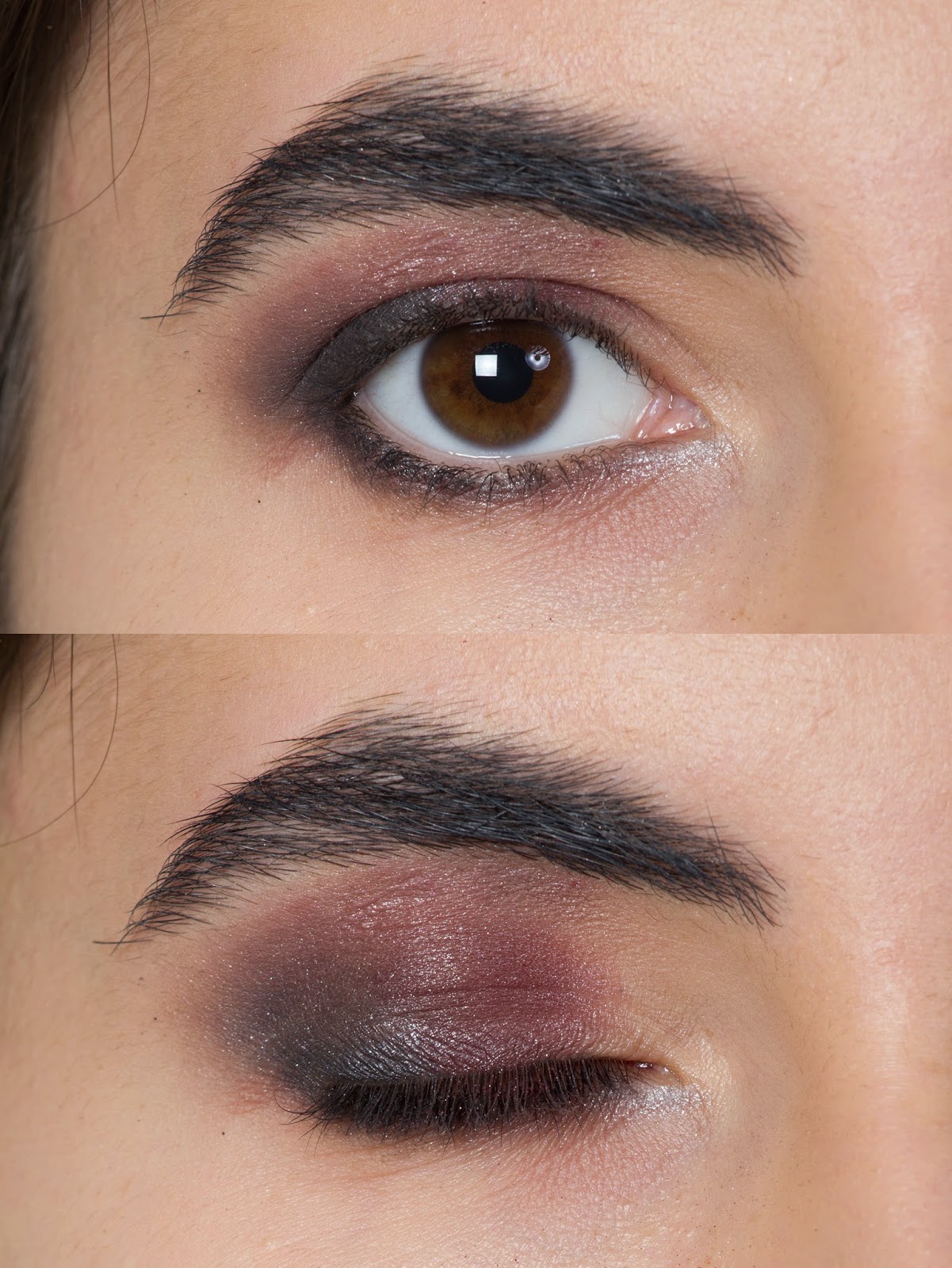 Take a burgundy eyeshadow shade, place the brush on to the middle of your eyelid and blend again in a circular movement, working over the anthracite eyeshadow. This will give the anthracite a less darker shade and a bit of glitter (if your eyeshadow is glittery).