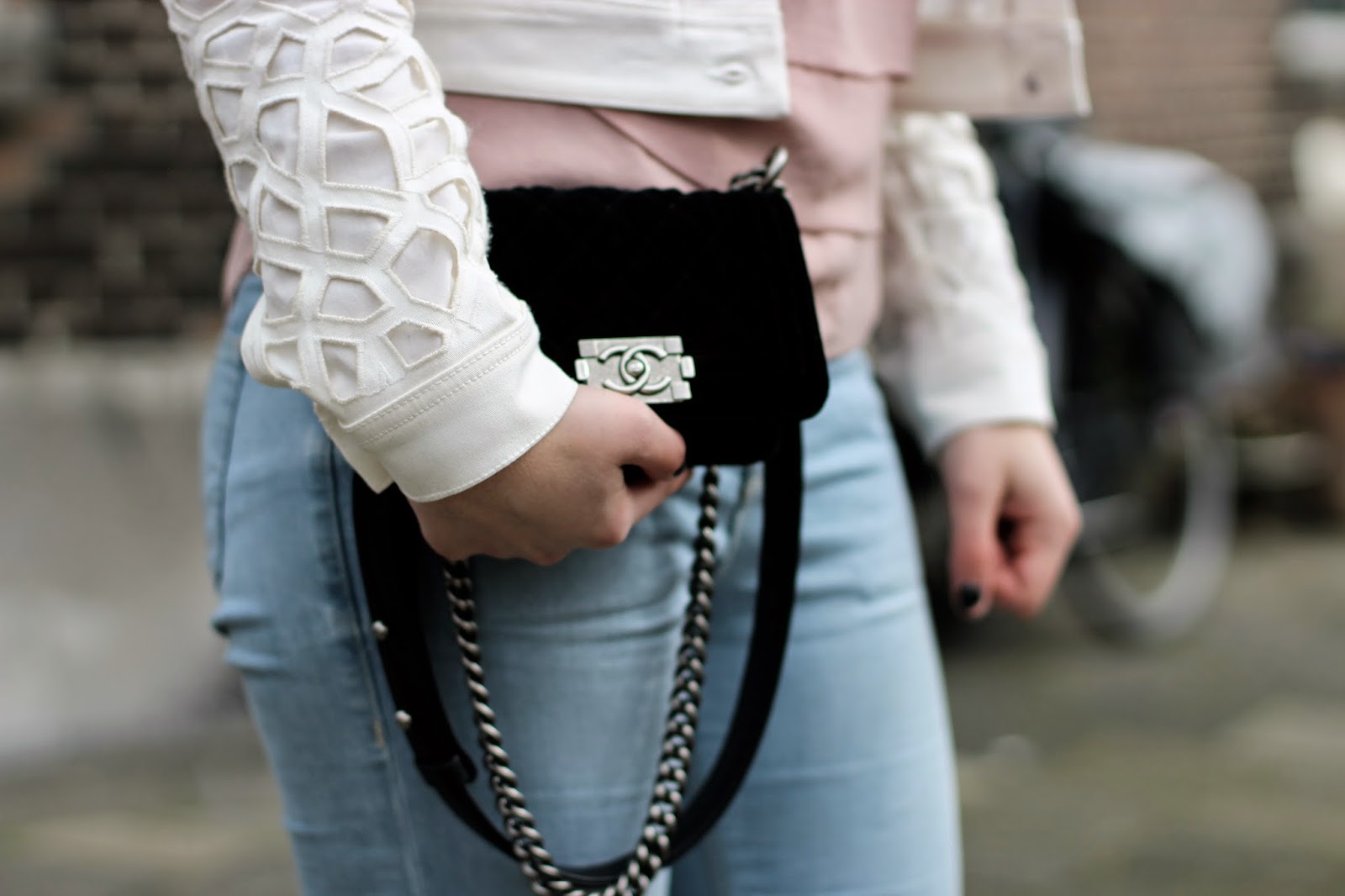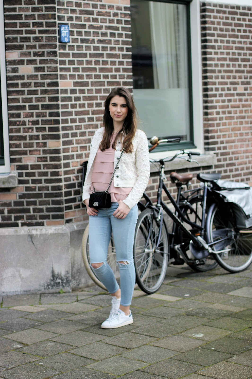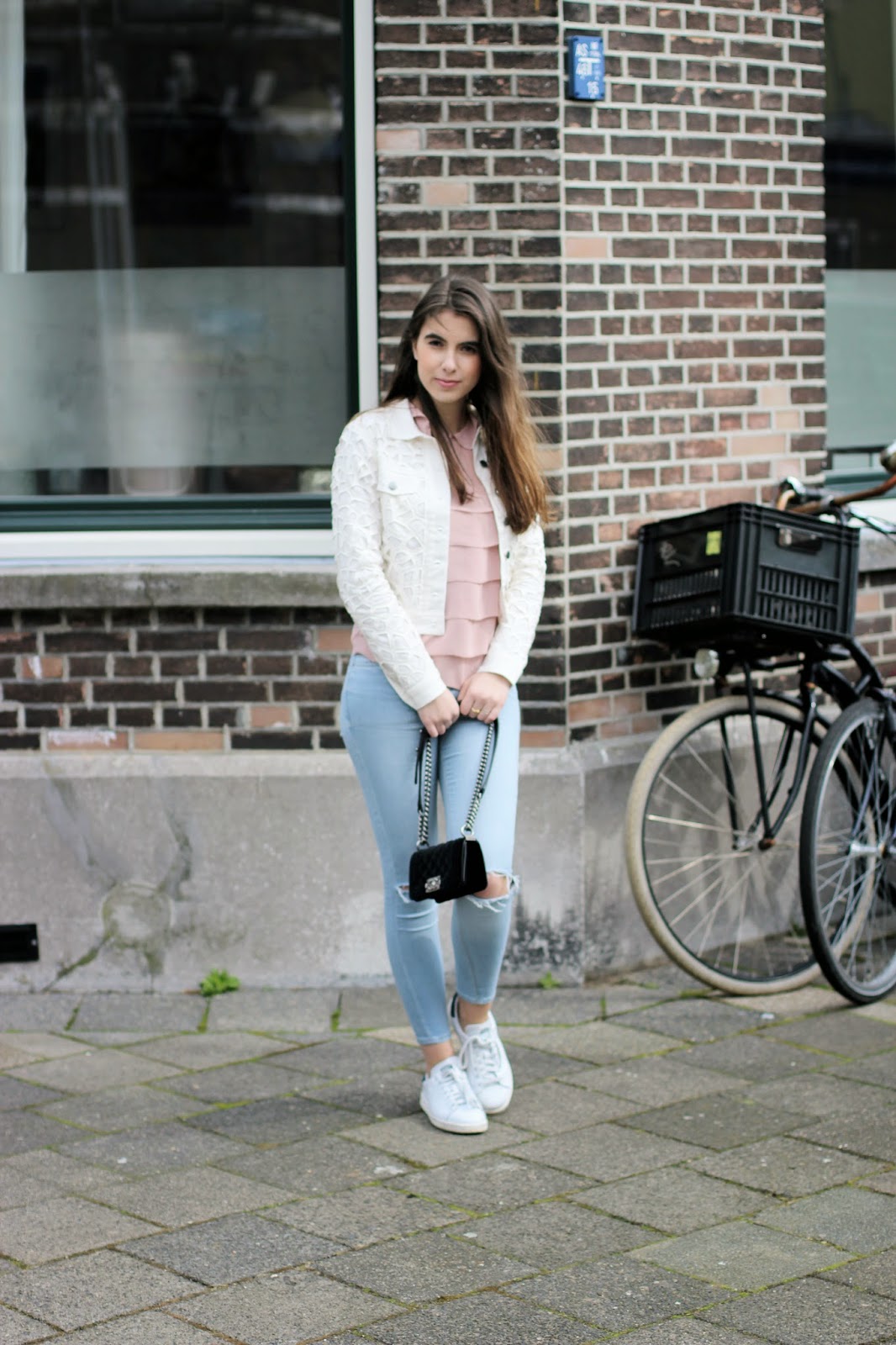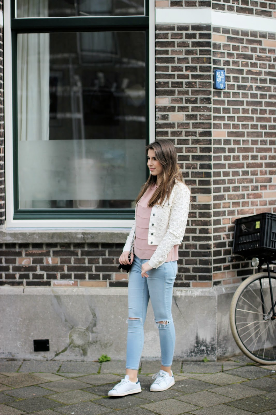 Spring is for colors, so, for this look I did my best to avoid wearing black by matching my favourite ripped jeans with my new white jacket, and a "cute" blush pink collar shirt.