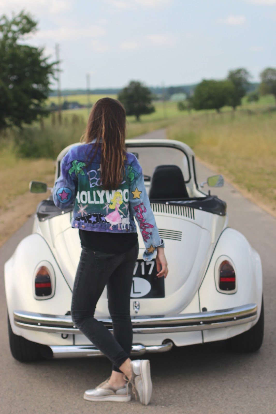 Remember I told you in one of my previous posts (here) that I was having a denim jacket painted? Well here is the result, its 'll about Barbie! I know it may come across as really kitsch but isn't fashion all about combining kitsch, chic and neutral colours?