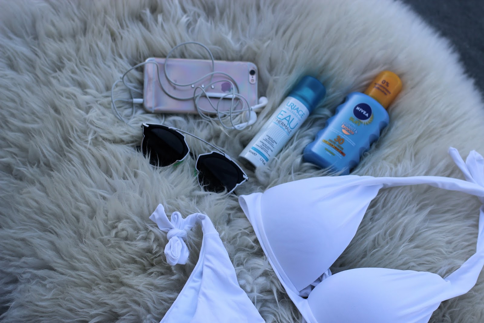 Today, I have put together my beach essentials: a bikini,some stylish espadrilles, a pair of trendy sunnies, my phone for listening to some music whilst sunbathing and, not to forget, sun cream.